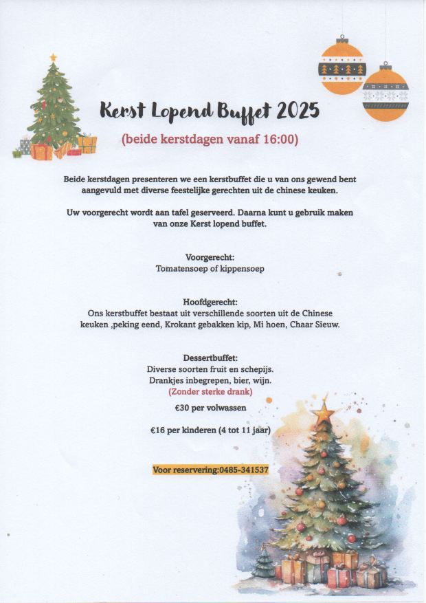 Lopend Buffet incl. frisdranks: elke zondag vanaf 16:30 uur (kinderen 4 t/m 11 jaar €13 & volwassene €22). Nieuws Lees ons laatste nieuws AKTIEMENU( VOOR 2 PERS ) €27(November)1 Tomaten soep6 st mini loempia’s2 st SateBabi pang gangTjap Tjoy met kipNASI en BAMI Onze menukaart Laat u verrassen door de Chinese en Indische smaken in restaurant China. Ook hebben wij Hollandse gerechten en kindermenu’s. Menukaart Restaurant China Rijksweg 65854 AT Bergen0485 – 34 15 3706 – 19 35 74 69 Openingstijden Maandag: Gesloten(op feestdagen altijd Open)Dinsdag: 16:00 – 21:00Woensdag: 16:00 – 21:00Donderdag: 16:00 – 21:00Vrijdag: 12:00 – 21:30Zaterdag: 12:00 – 21:30Zondag: 12:00 – 21:30 Neem contact met ons op